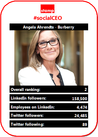We are into the top two of the top ten #socialCEOs (based our October 2013 report data). At number 2 – and soon to be departing these shores – luxury fashion house Burberry’s Angela Ahrendts.